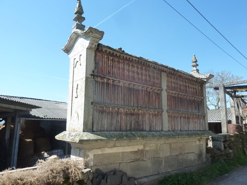 De graanhuisjes of ‘horreos’ komen we nu overal tegen in Galicia.